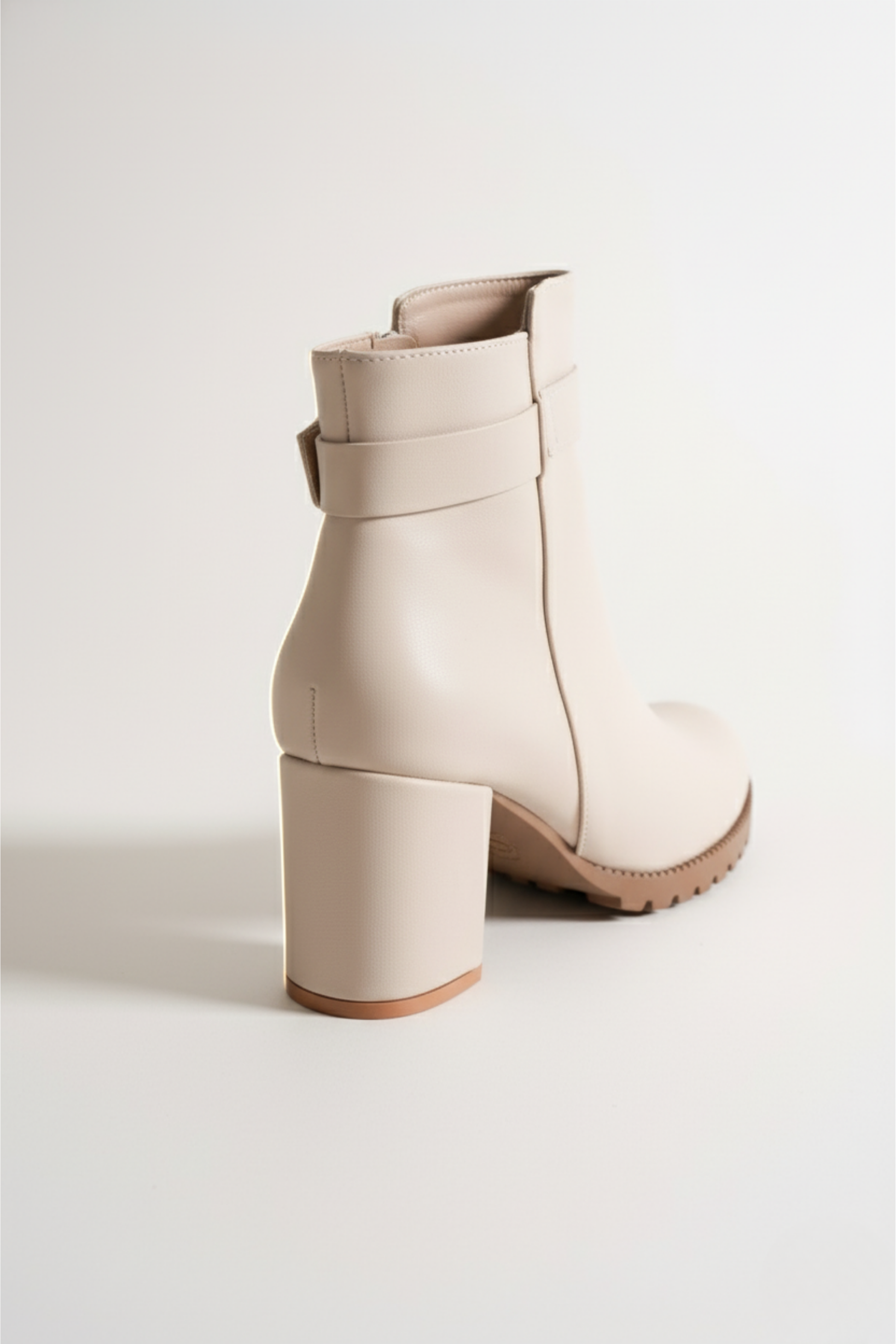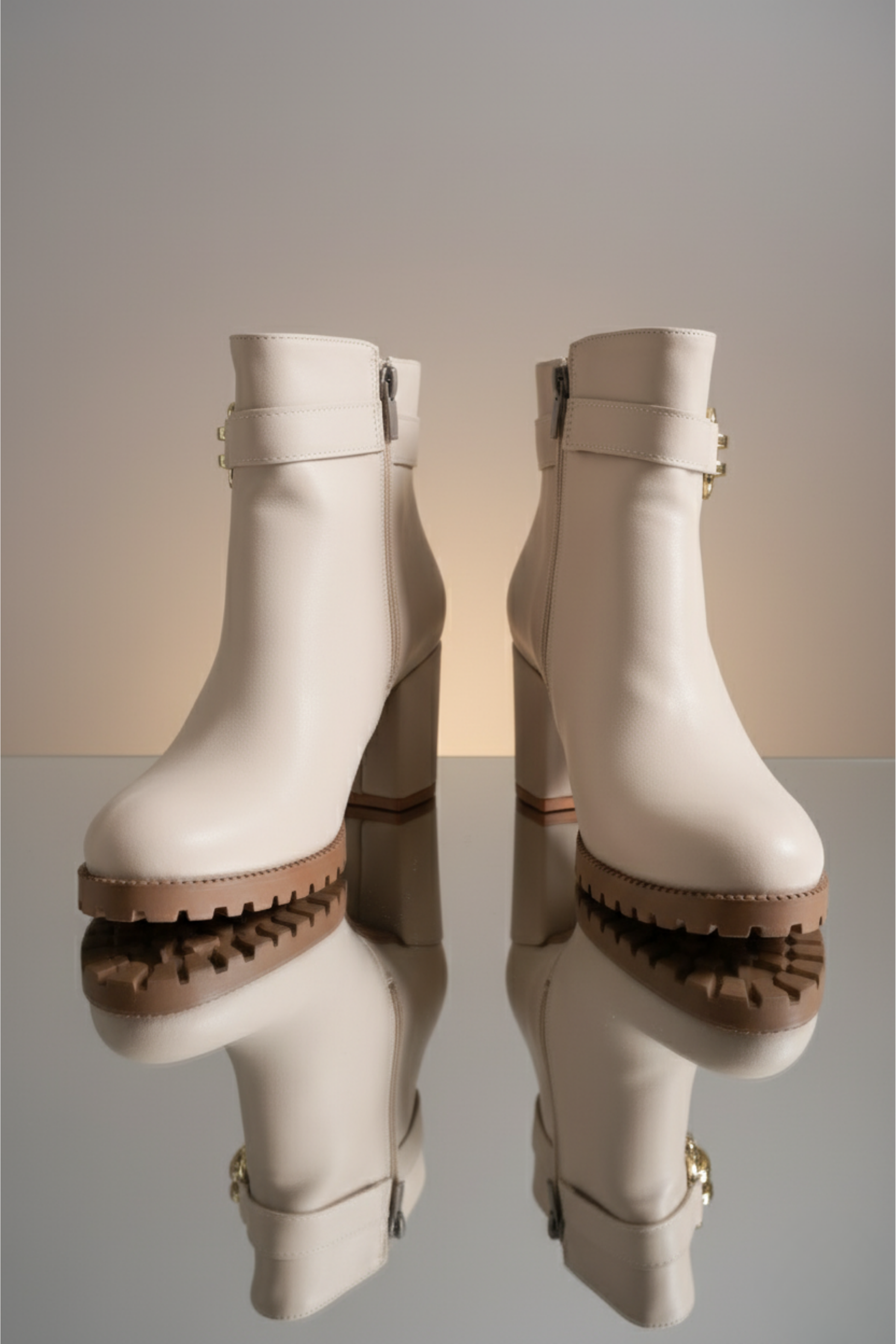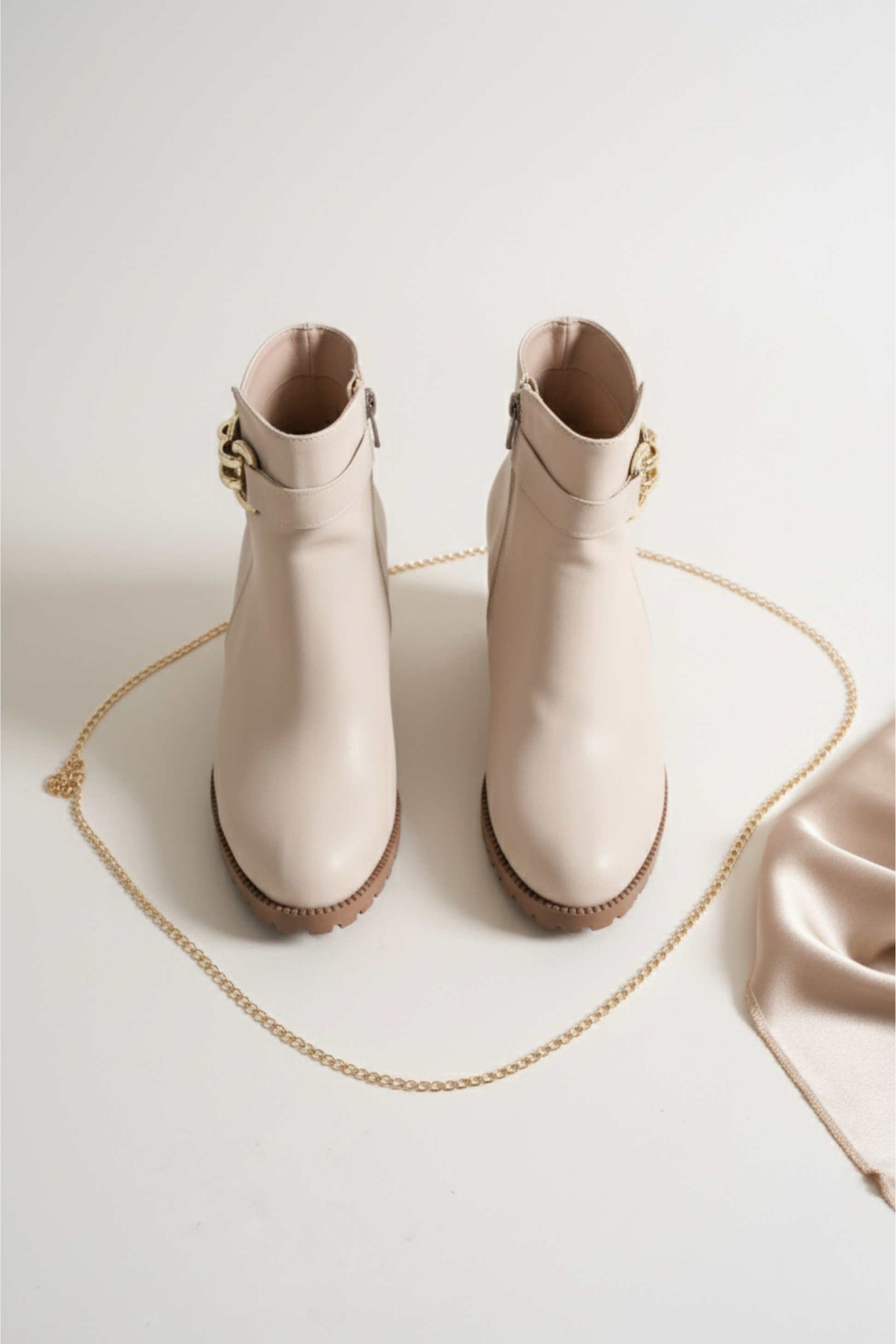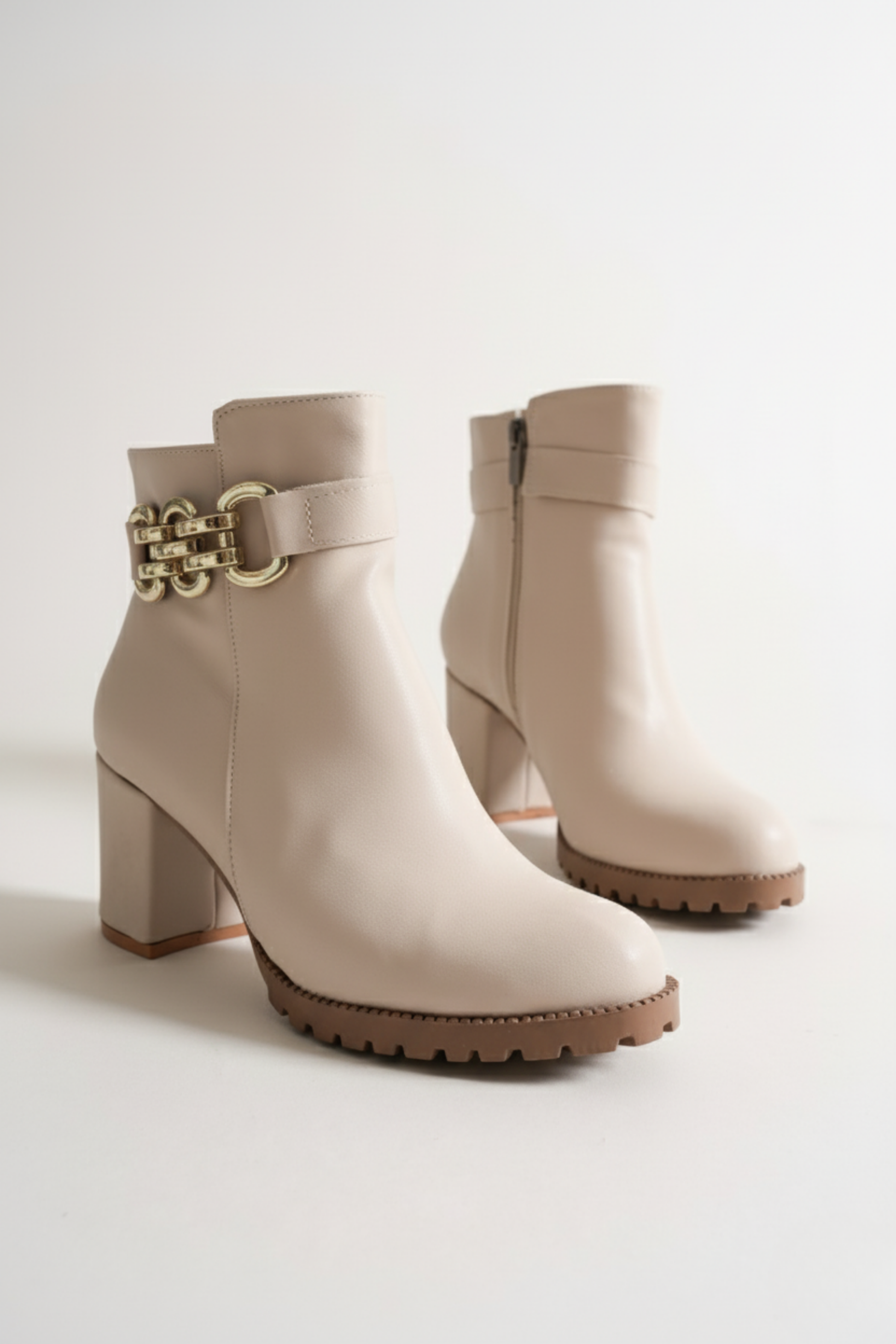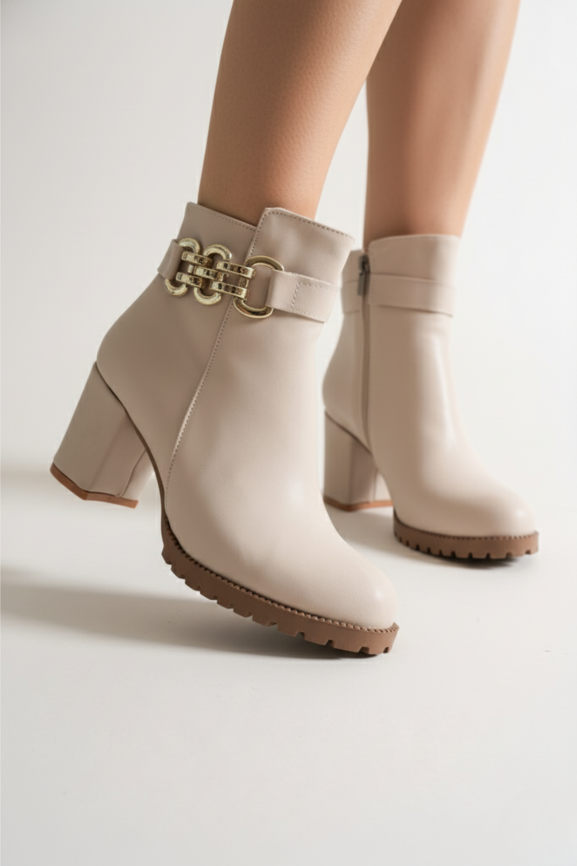 Brielfy’nin altın tokalı bej topuklu bot modeliyle zarafeti adımlarınıza taşıyın.