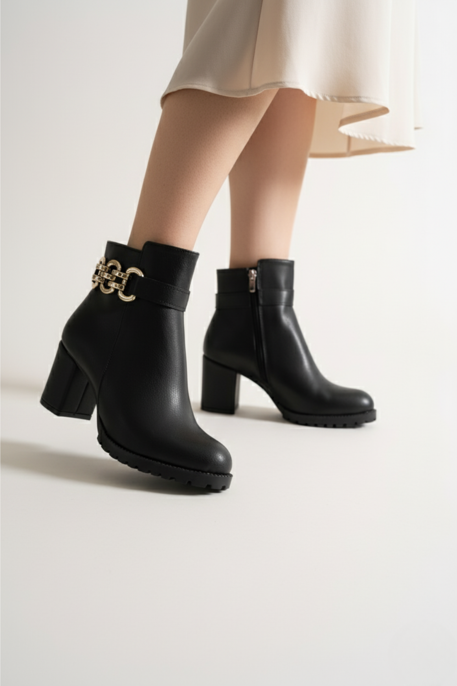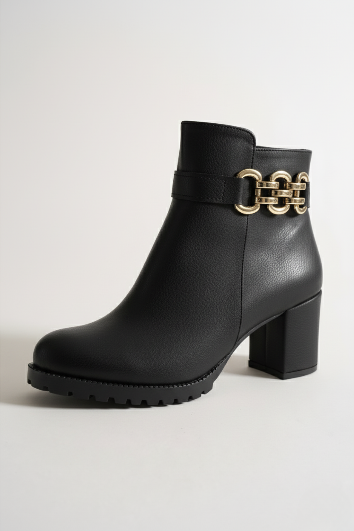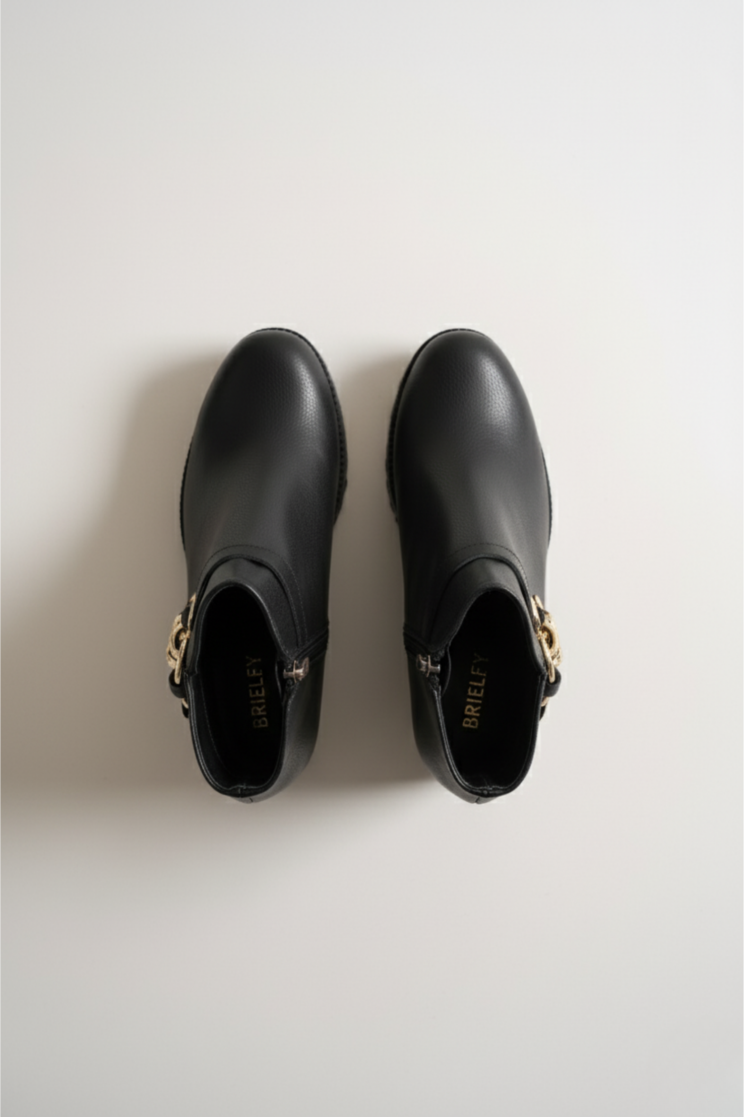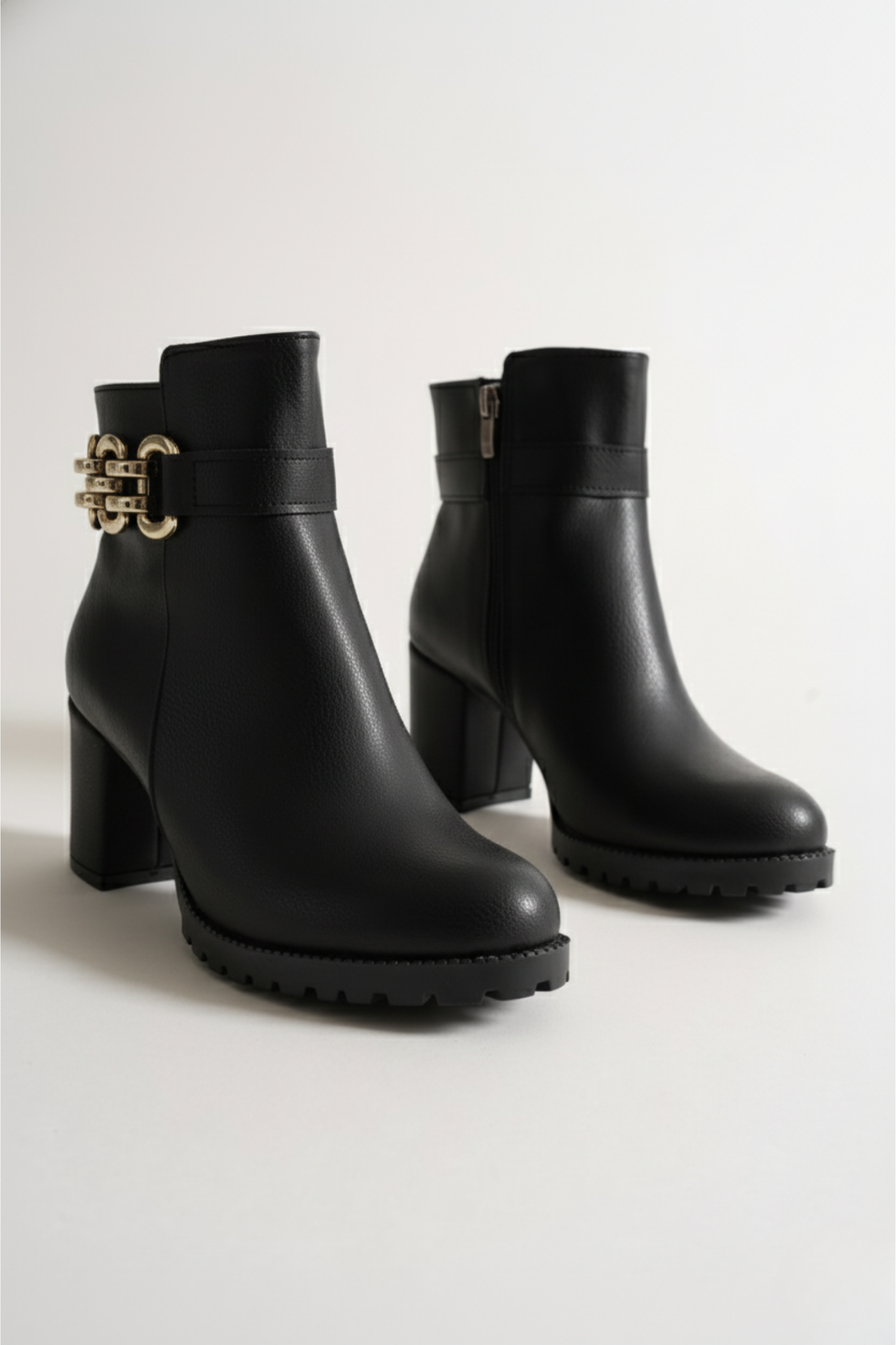 Brielfy’nin altın tokalı siyah topuklu bot modeliyle zarafeti her adımda hissedin.