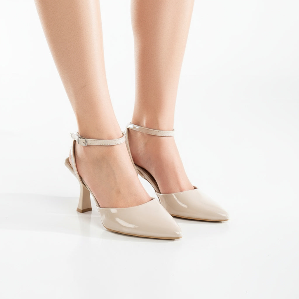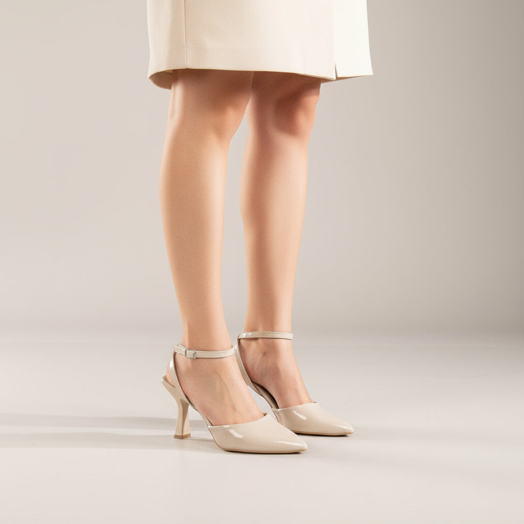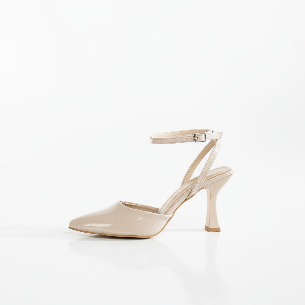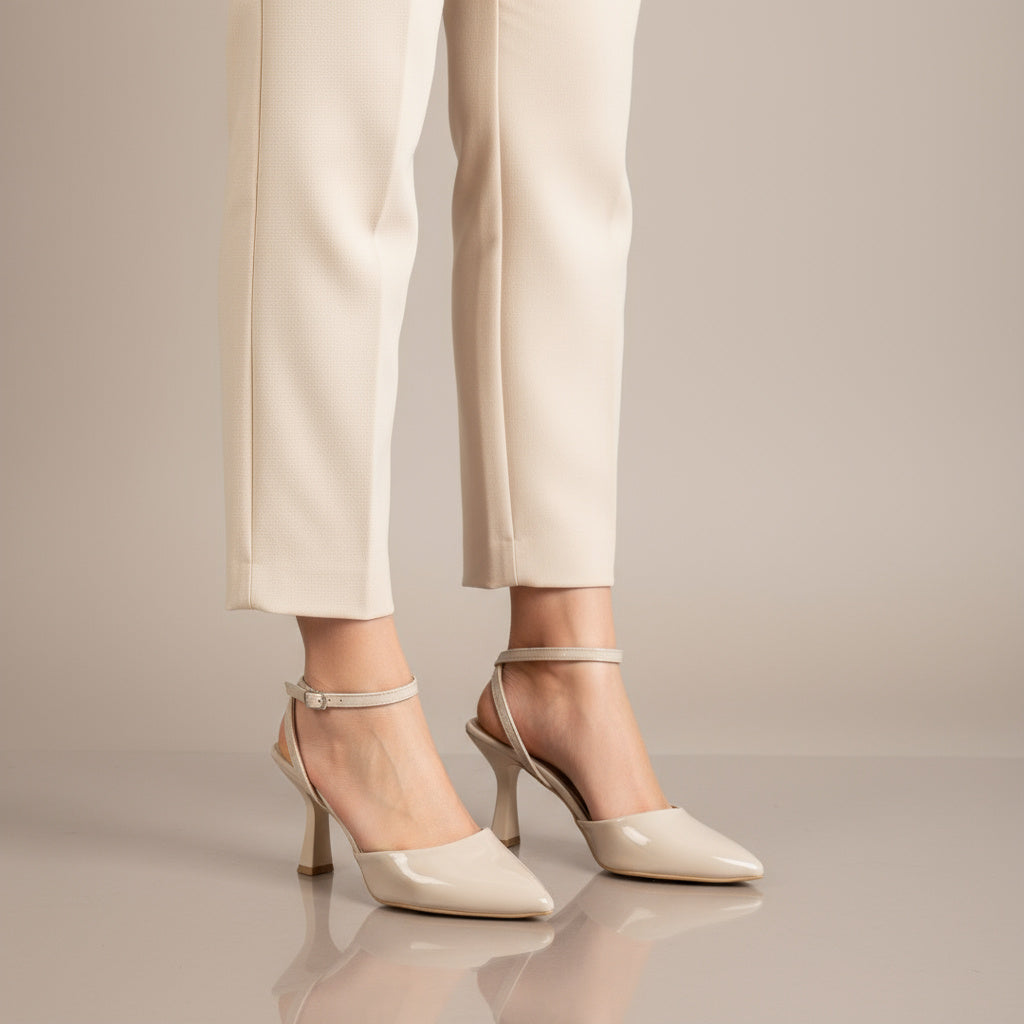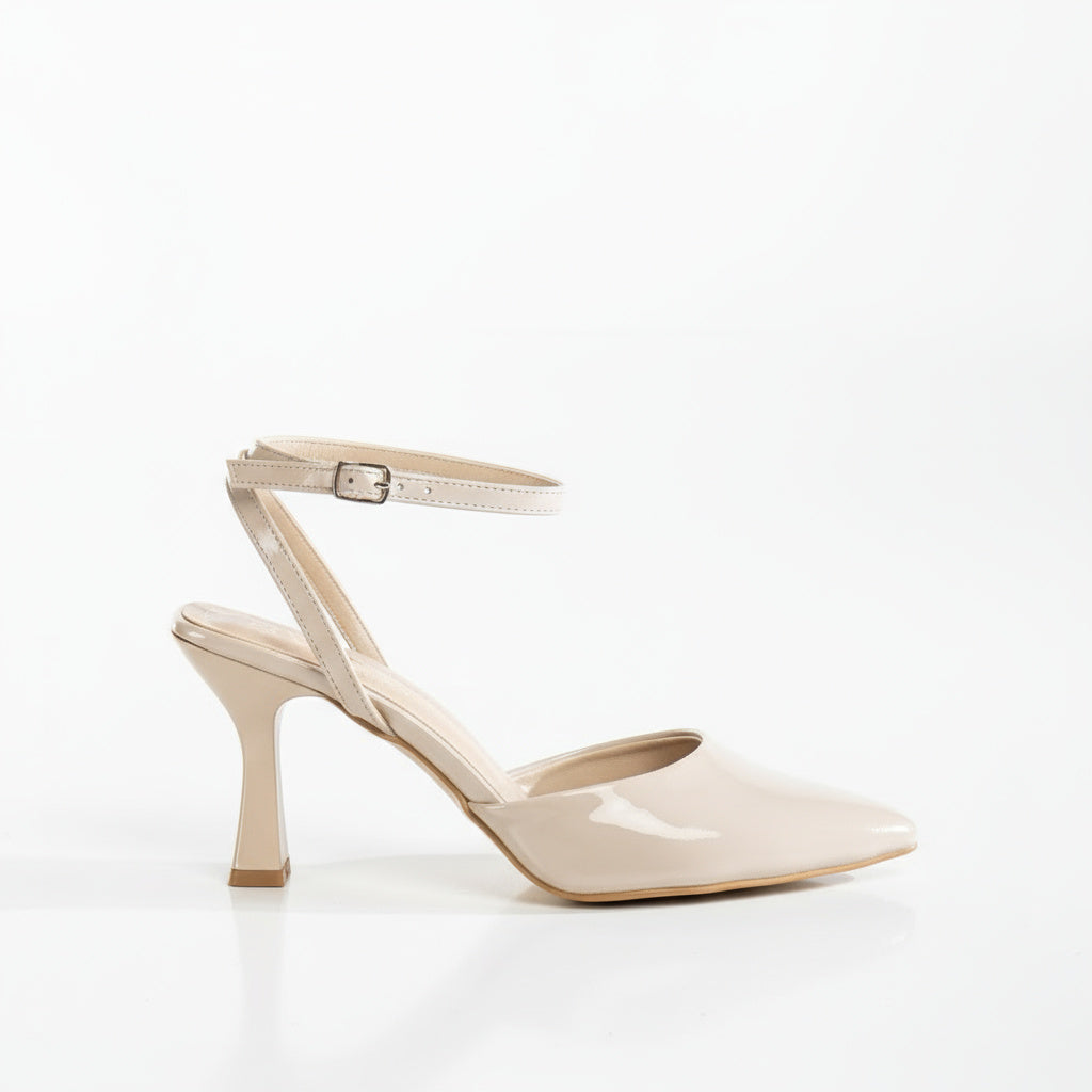 BRIELFY – Bej Bilekten Bağlamalı İnce Topuk Ayakkabı – 9 cm Parlak Görünümlü