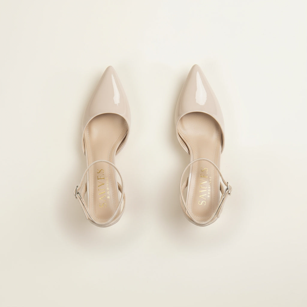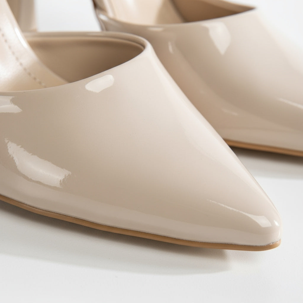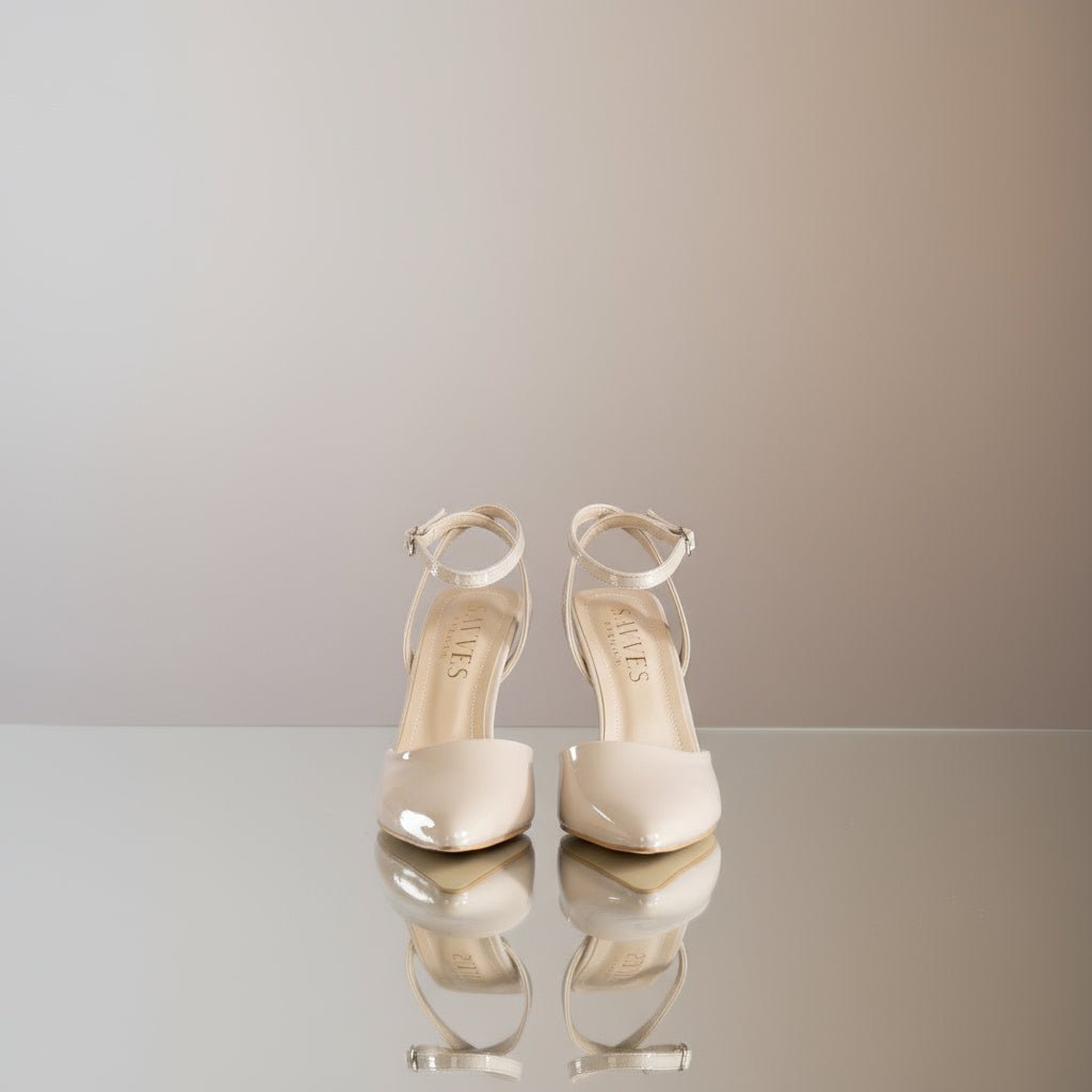 Parlak bej yüzeyi ve ince 9 cm topuğu, her görünümü zarafetle buluştururken, ayarlanabilir bilek bandı rahat bir kullanım sağlar.