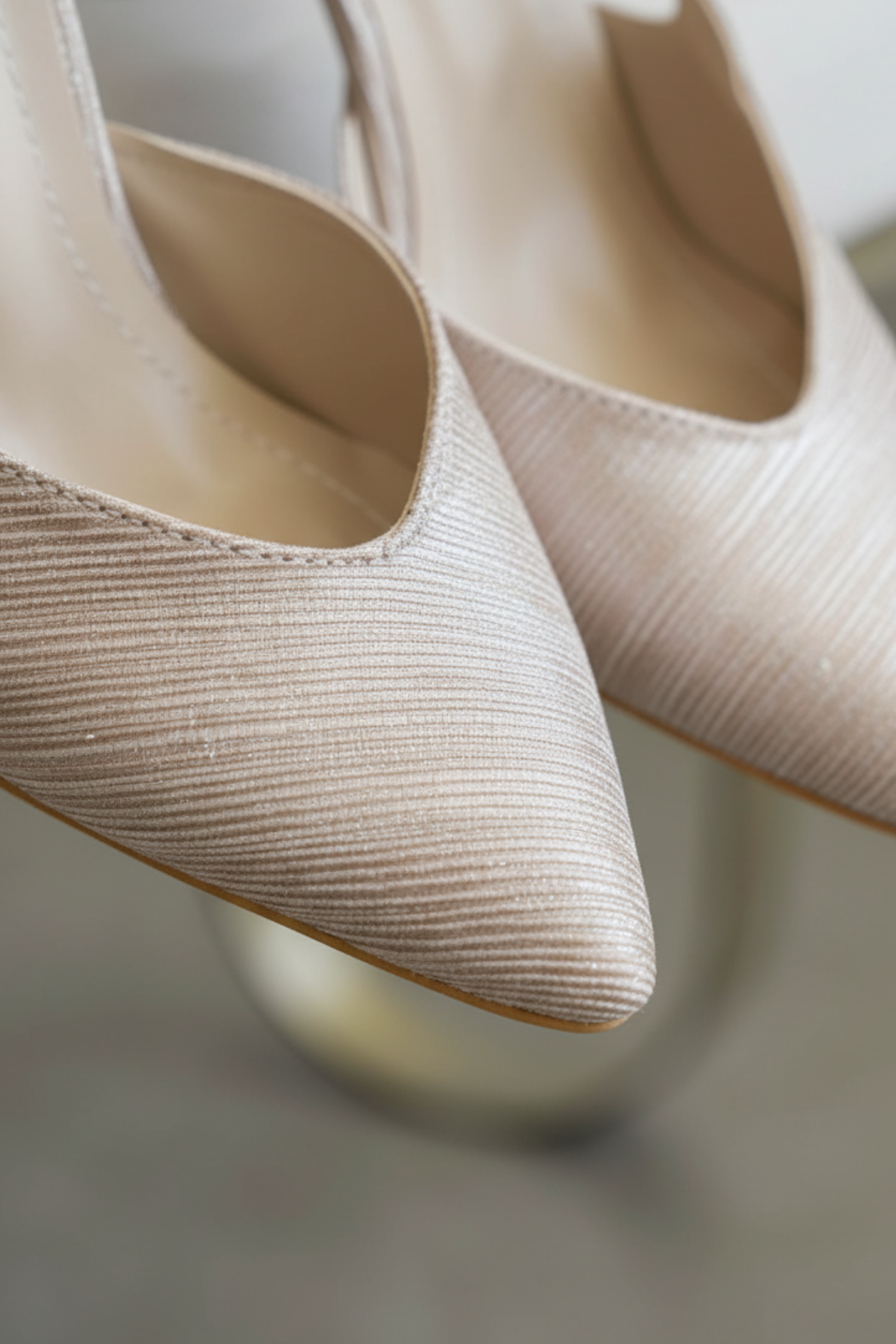 BRIELFY Bej Simli Slingback, ince silueti ve zarif 9 cm topuğuyla her adımda şıklığı hissettirir.