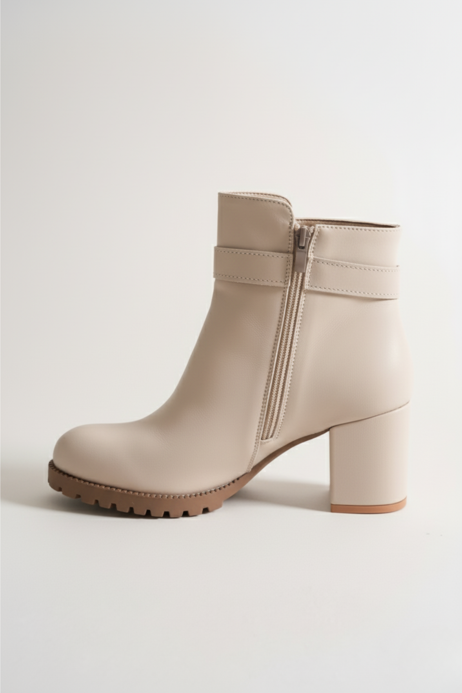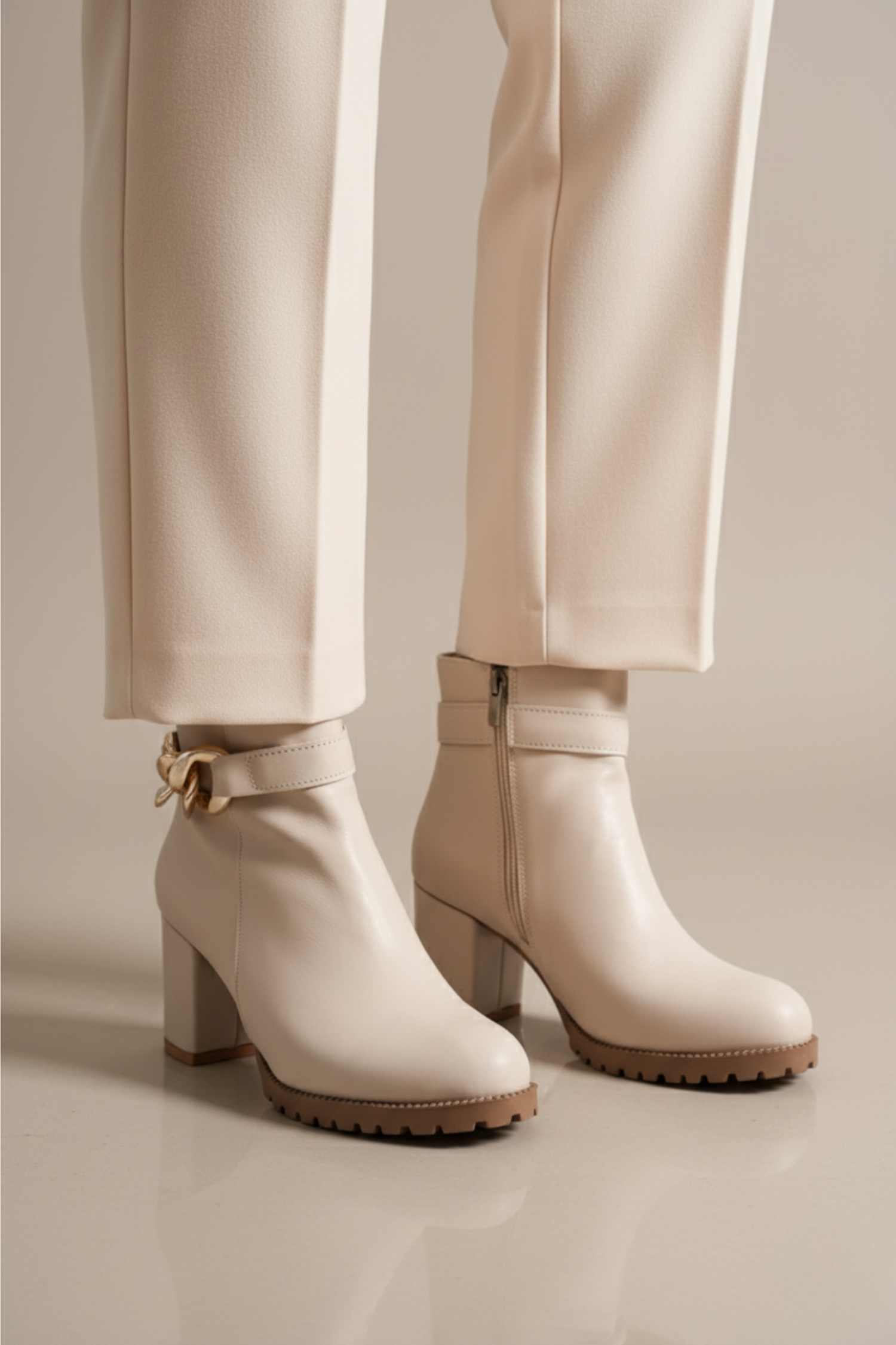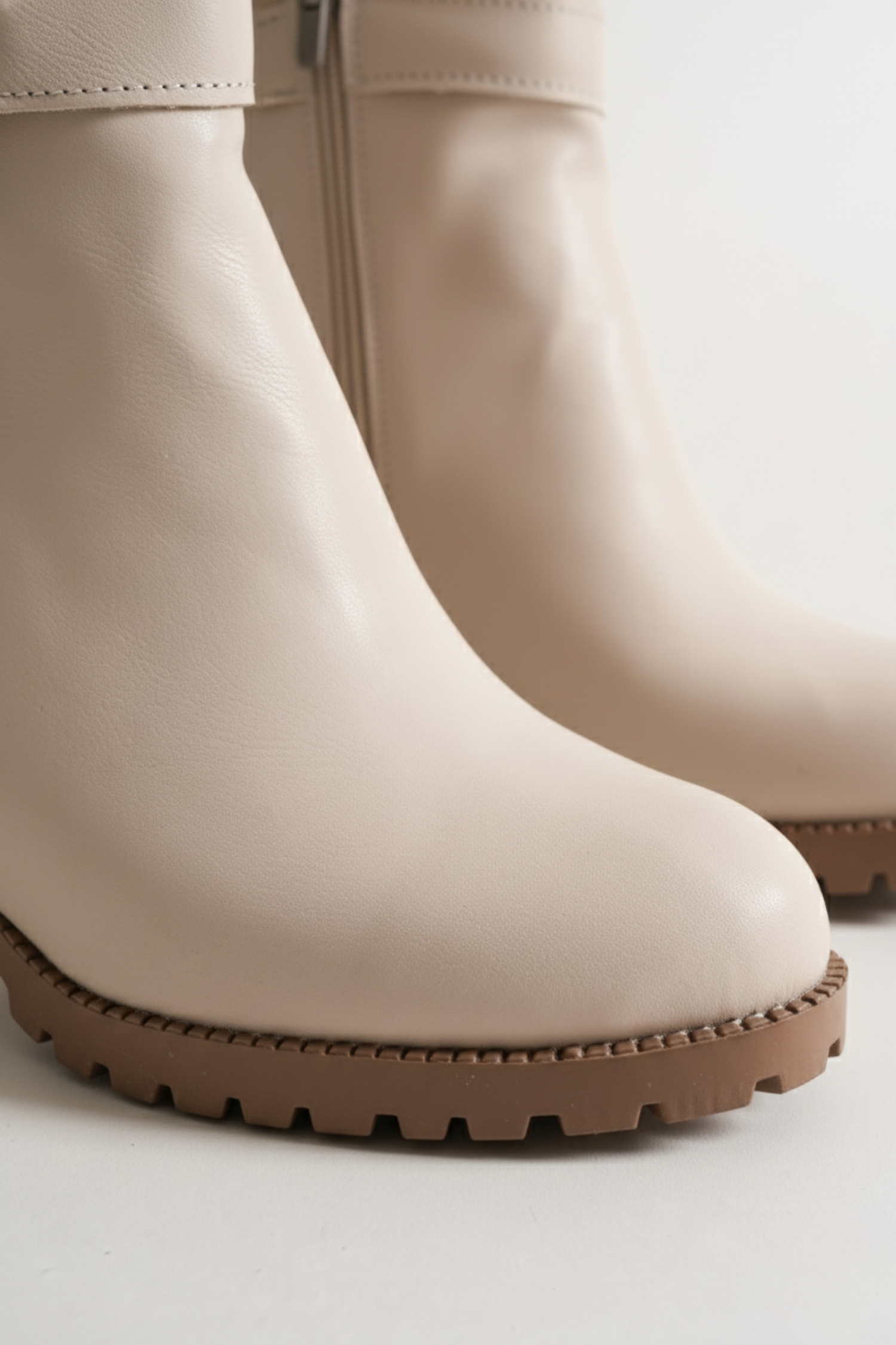 Brielfy kalitesiyle üretilen burma tokalı bej bot, minimalist lüksün sembolü.