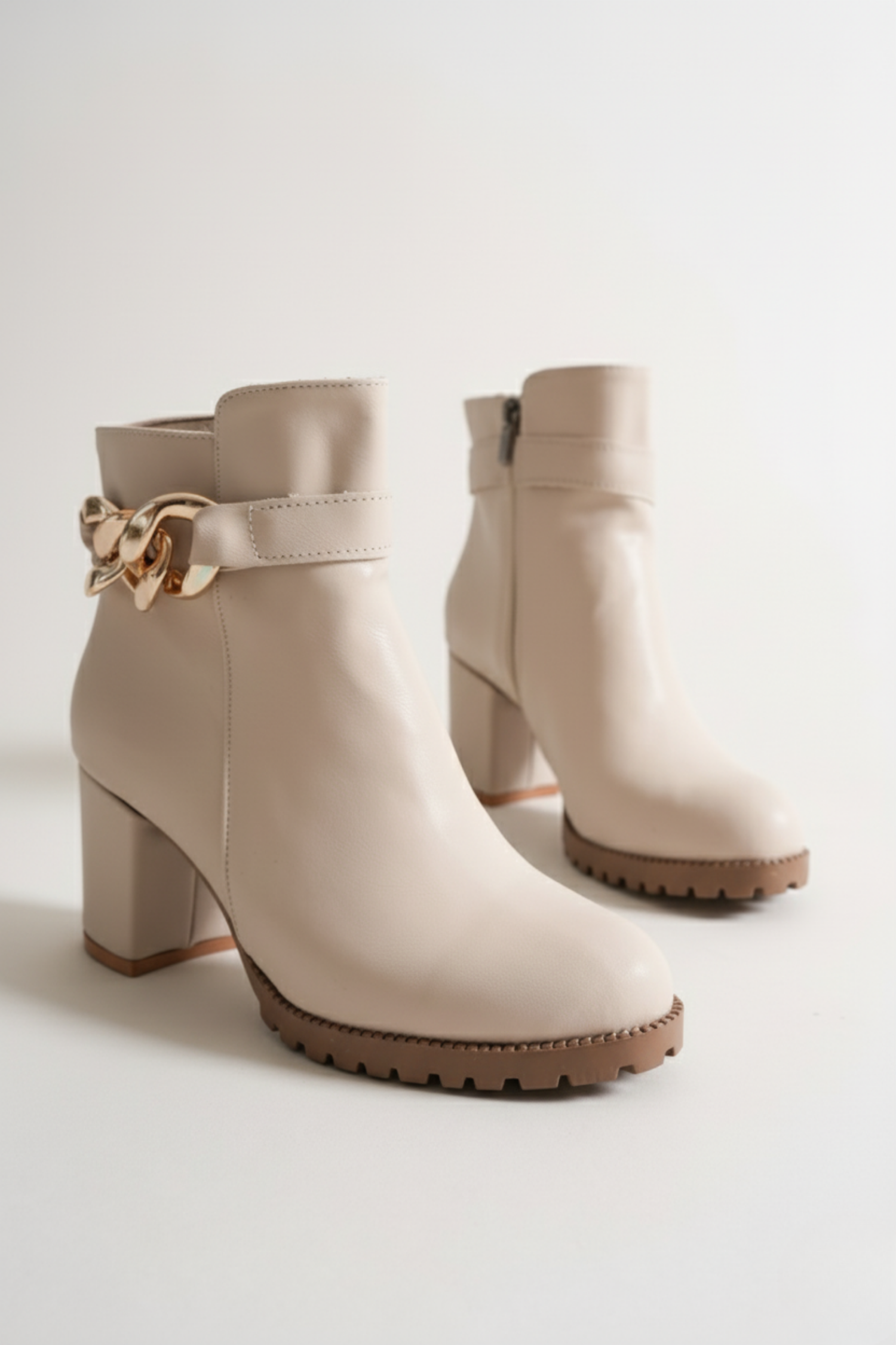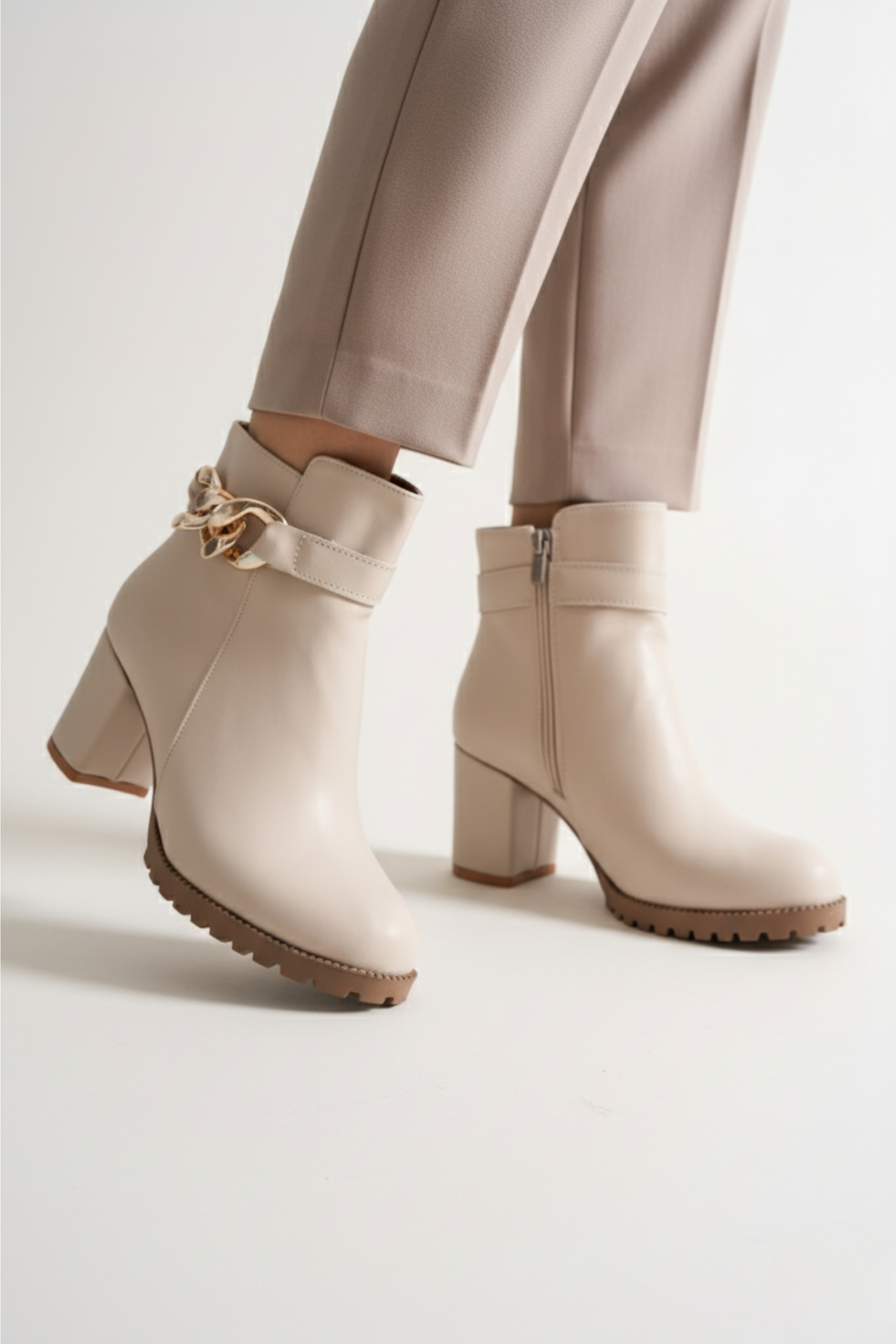 Altın detaylı bej kışlık topuklu bot, kış kombinlerine zarif bir ışıltı katıyor.