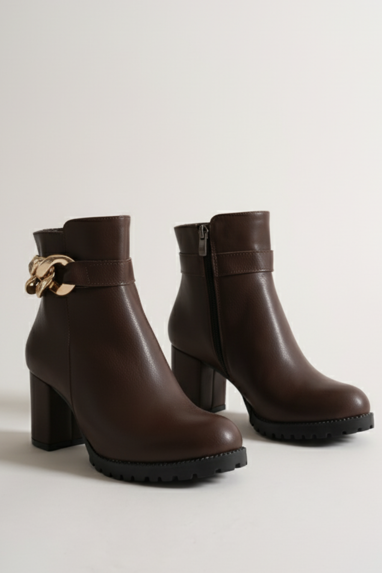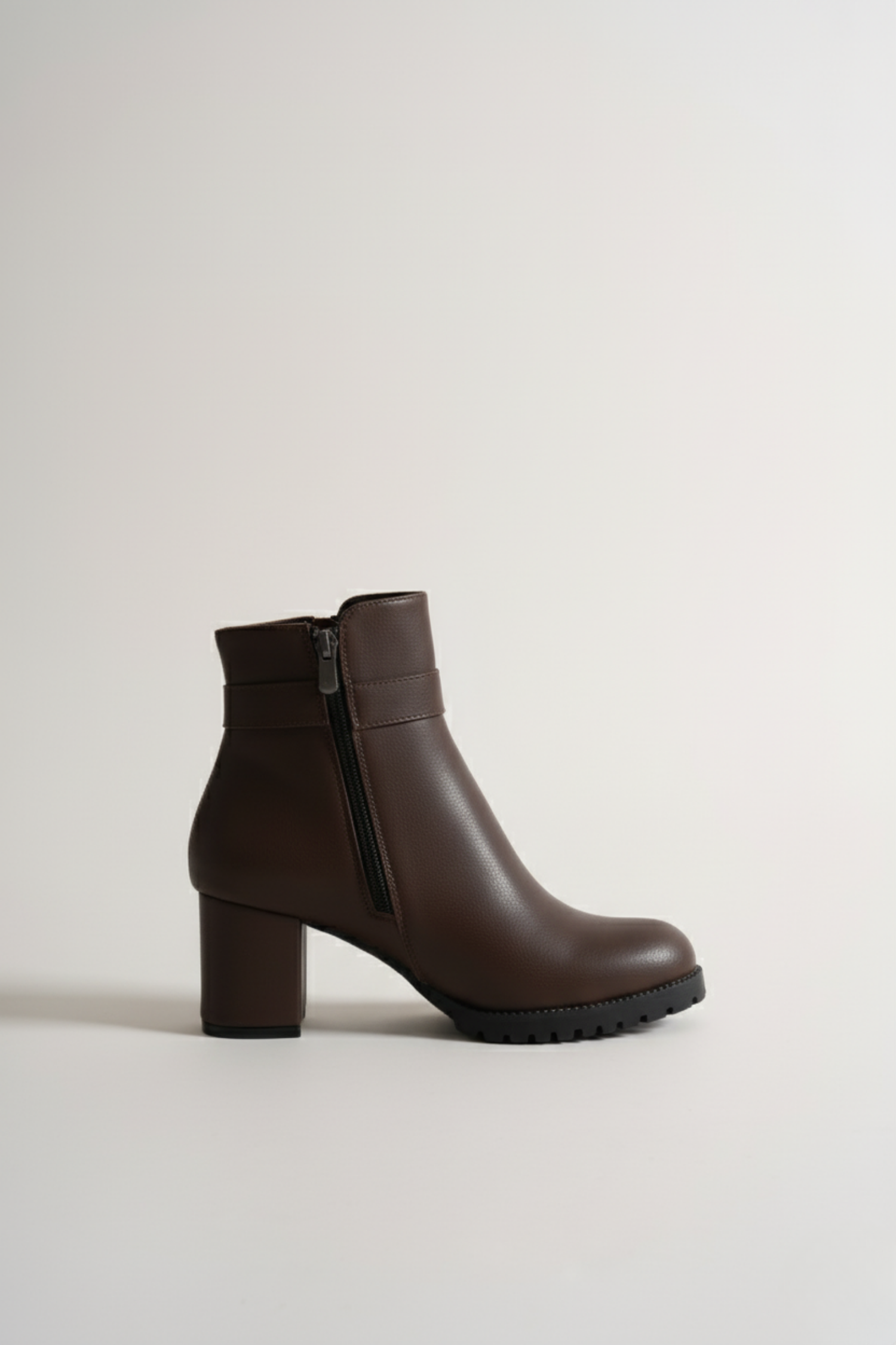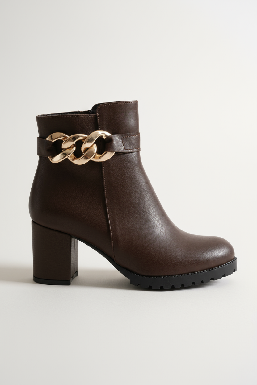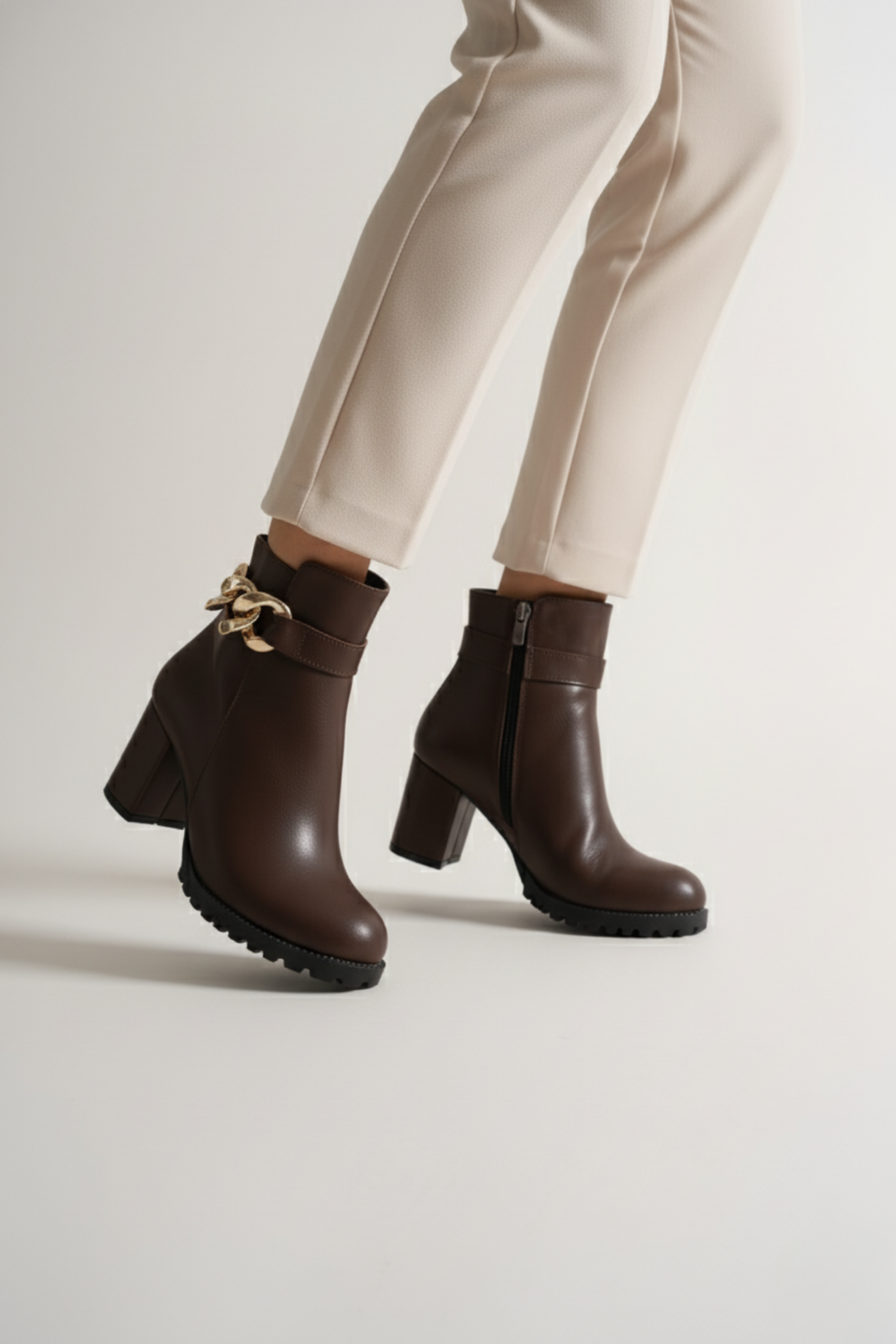 Brielfy kalitesiyle üretilen topuklu kahverengi kadın bot, her adımda güven ve zarafet sunar.