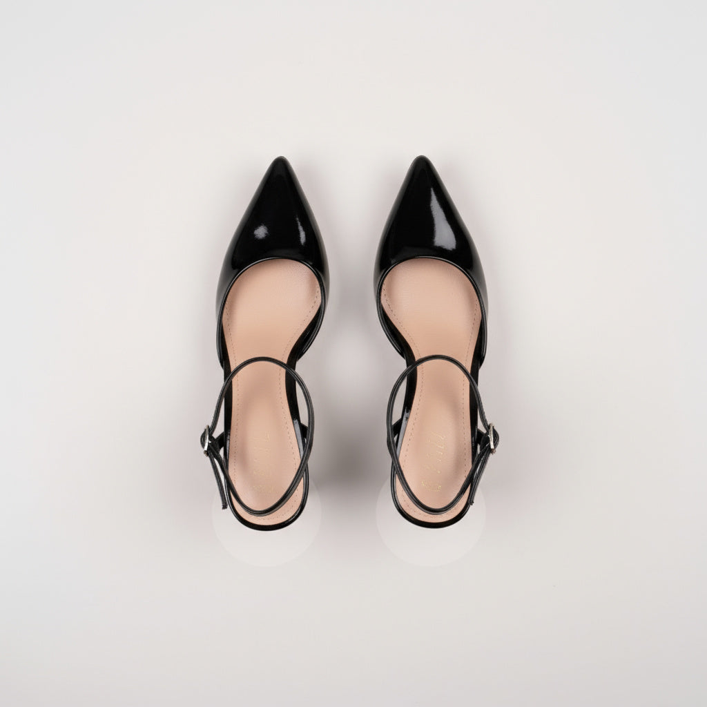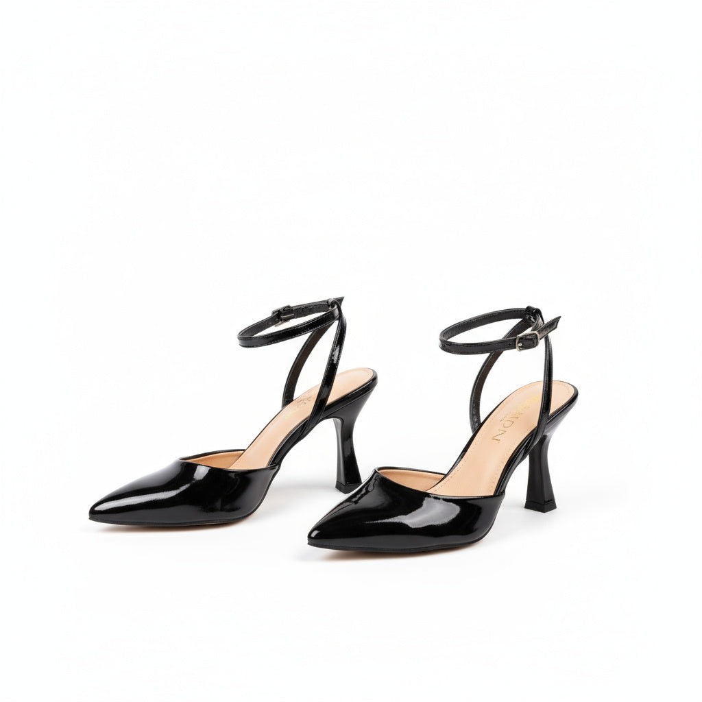 BRIELFY – Siyah Bilekten Bağlamalı İnce Topuk Ayakkabı – 9 cm Rugan Görünümlü
